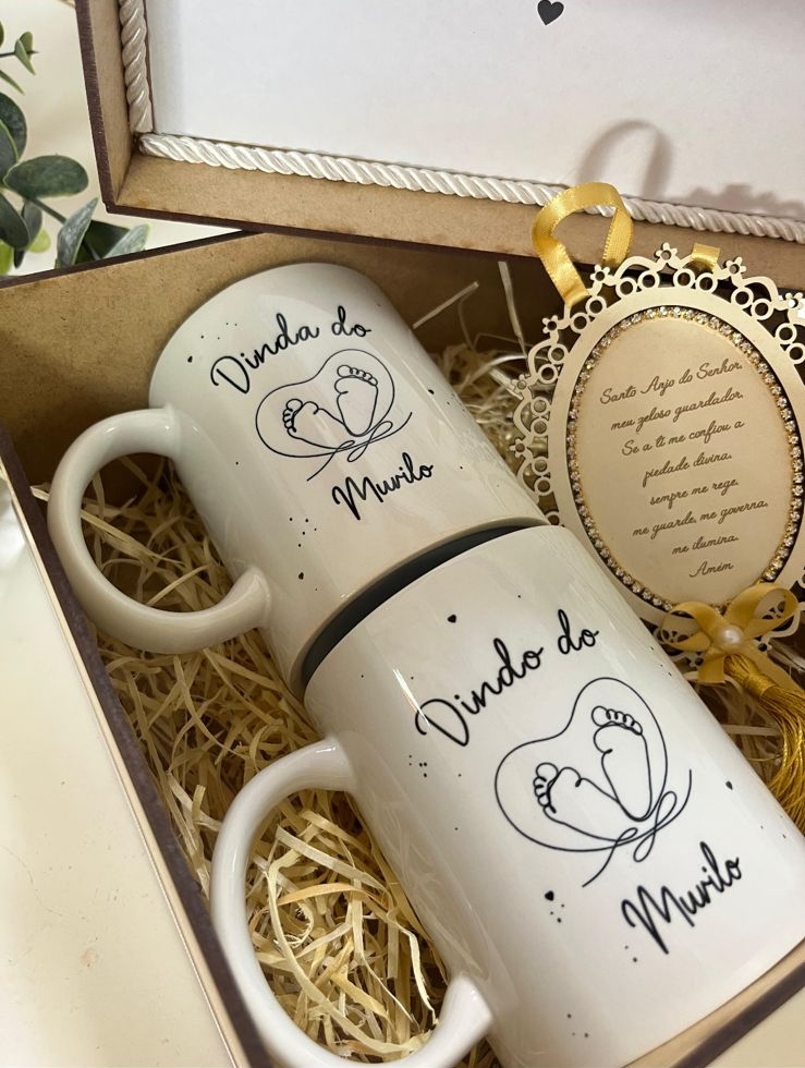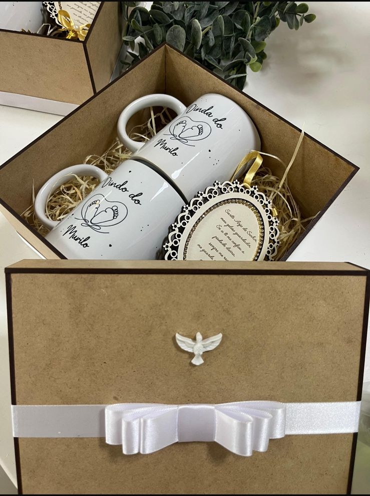 Caixa em mdf 3mm cru, tamanho 20x20 com canecas, mensagem na parte interna e plaquinha do santo anjo.